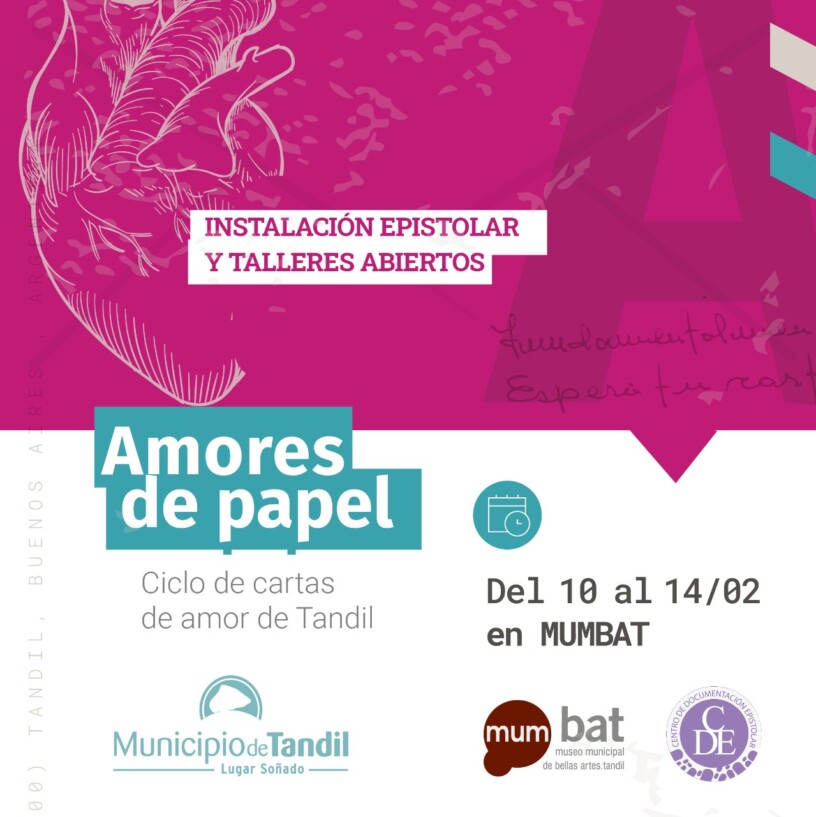 En el marco de esta iniciativa se realizará del 10 al 14 de febrero "Amores de papel", un ciclo de cartas de amor tandilenses, que incluirá una instalación y muestra epistolar en el MUMBAT y, durante los días sábado 13 y domingo 14, se incluirán también talleres gratuitos vinculados a la práctica epistolar para niños y adultos, además de un espectáculo para toda la familia.